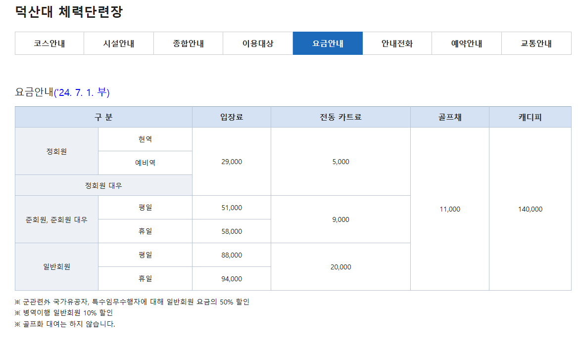 덕산대 요금은 정회원, 준회원, 준회원 우대, 일반회원으로 구분해서 요금이 달라집니다. 아래 요금안내표를 참고 하시기 바랍니다.