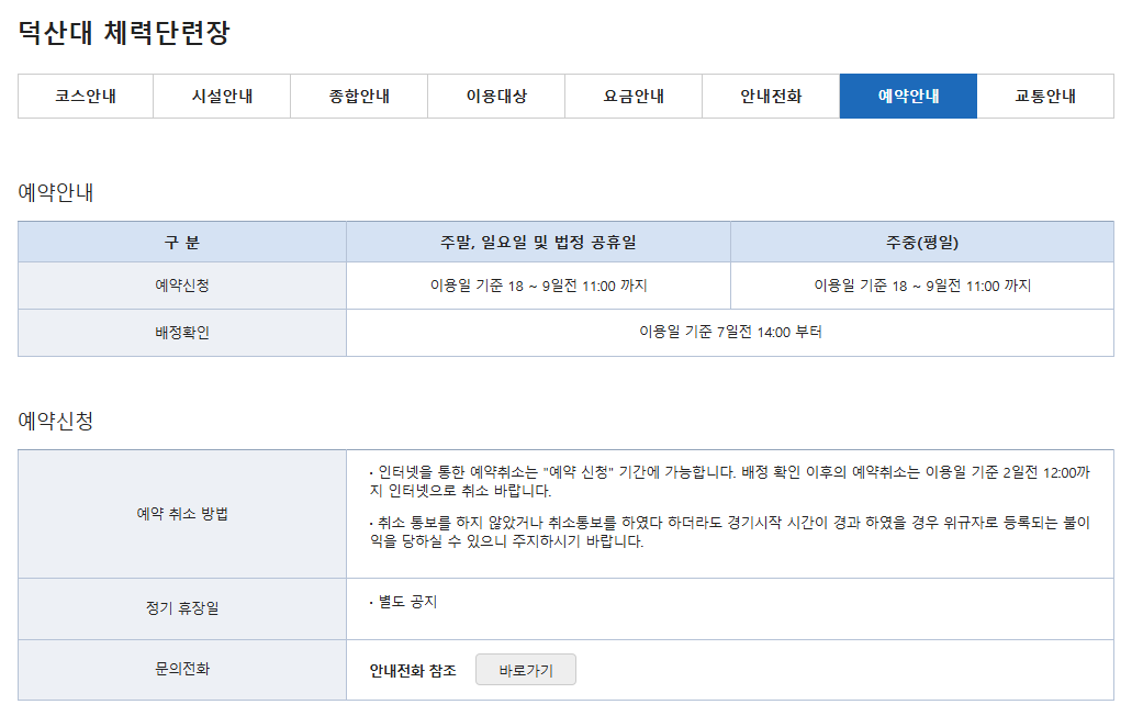 덕산대 예약안내는 신청기간 및 배정확인에 대한 내용을 참고하시고, 인터넷을 통한 예약 취소도 예약 신청 기간에 가능합니다.
